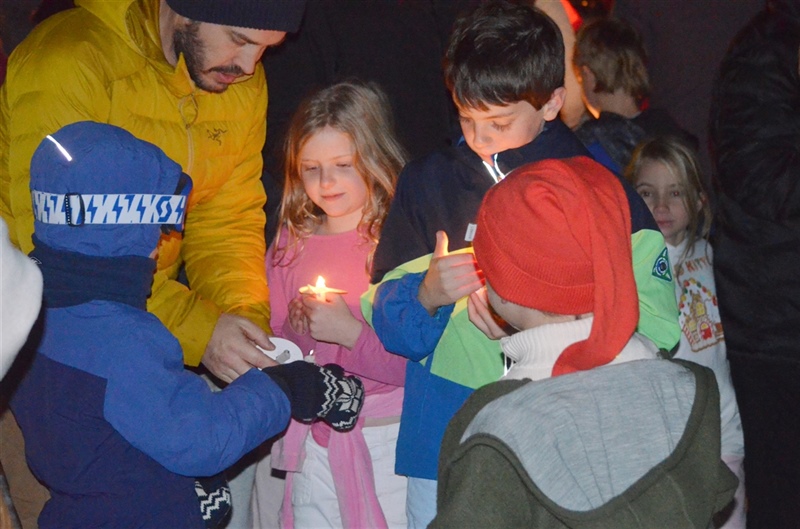 From left: Bill O’Neil lights a child’s candle as Cameron Romero and Jamie Romero protect their flames from the wind at the town tree lighting ceremony, Dec. 14. (Photo by Hannah Taylor)