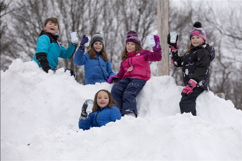 Cheers to no school! From left: Owen Little, Vivian Turner, Cali Roy, Maggie Little, and CeCe Turner enjoy a hot cocoa break after sledding behind the Bromfield School, Jan. 26. (Photo by Lisa Aciukewicz)