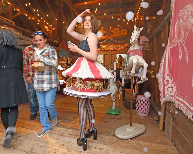 Clara Maglothin pauses in the doorway of her family’s barn as bubbles swirl around her on Halloween. Her mother Hilary Maglothin not only created her elaborate merry-go-round-themed costume but was the mastermind behind the barn’s tranformation. (Photo by Lisa Aciukewicz)