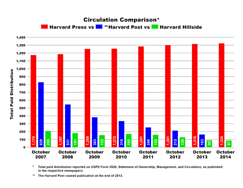 Each October, all publications that are mailed via the U. S. Postal Service are required to report their circulation statistics on USPS Form 3526. This form must then be printed in a subsequest issue of the publication. The chart below, based on Form 3526, is a comparison of the newspapers that serve Harvard. Click the chart to see a larger image.